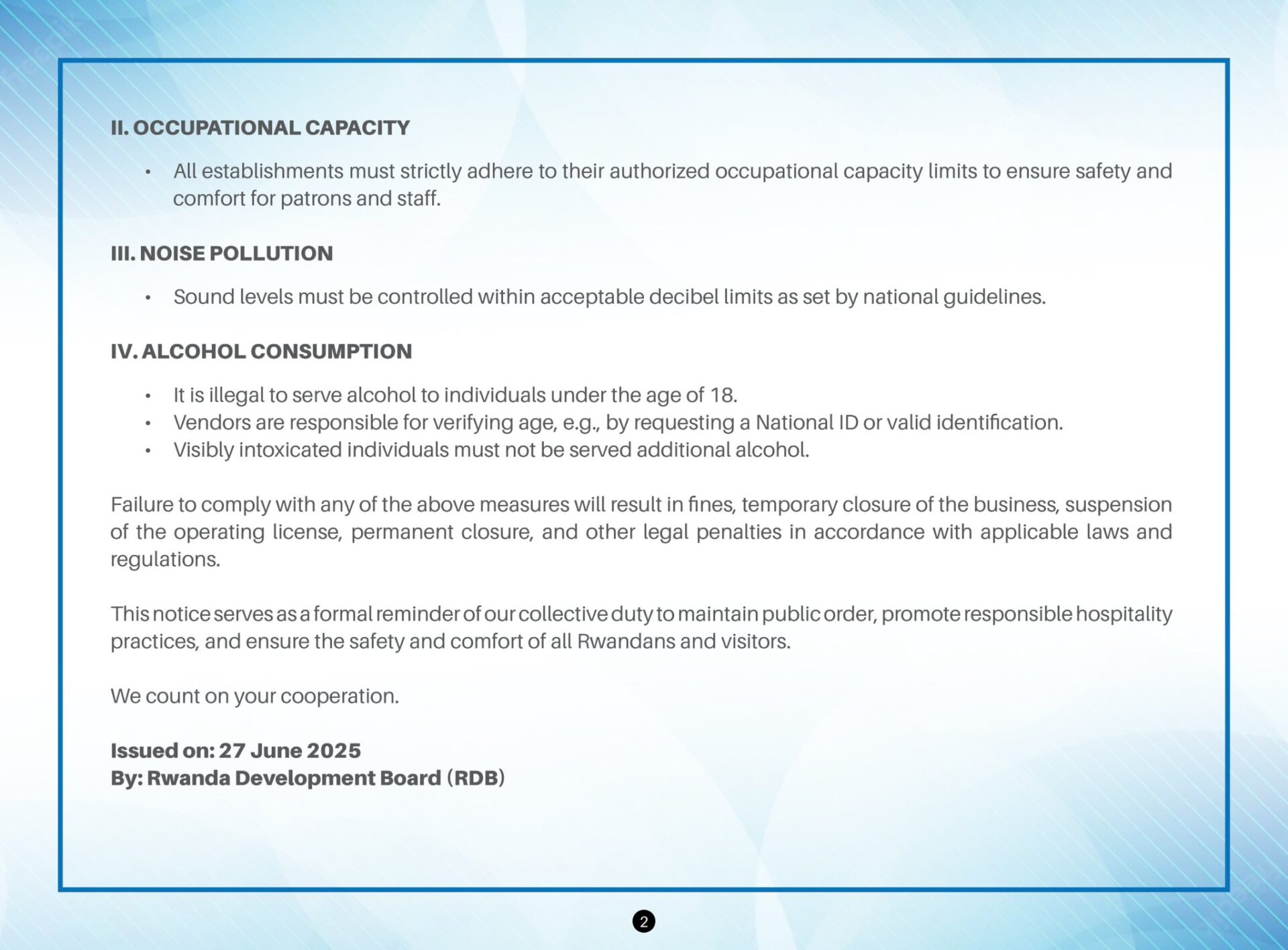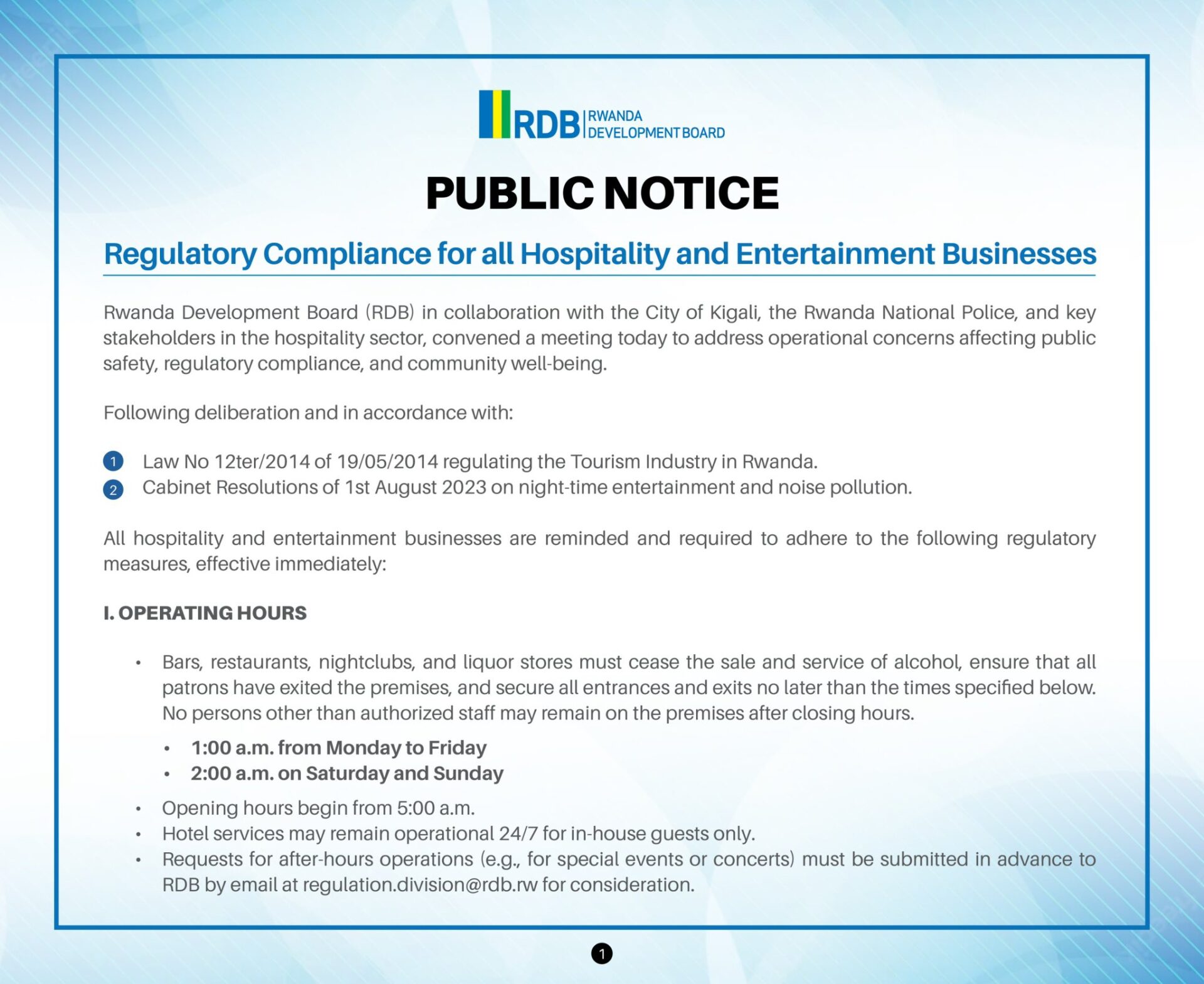 Urwego rw’Igihugu rushinzwe Iterambere (RDB) ku bufatanye n’Umujyi wa Kigali, Polisi y’u Rwanda n’abandi bafatanyabikorwa, rwasohoye itangazo rigaragaza amabwiriza mashya agenga imikorere y’ubucuruzi bwo kwakira abantu n’imyidagaduro, mu rwego rwo gukaza ishyirwa mu bikorwa ry’amategeko arebana n’umutekano rusange, urusaku no kurengera abaturage.