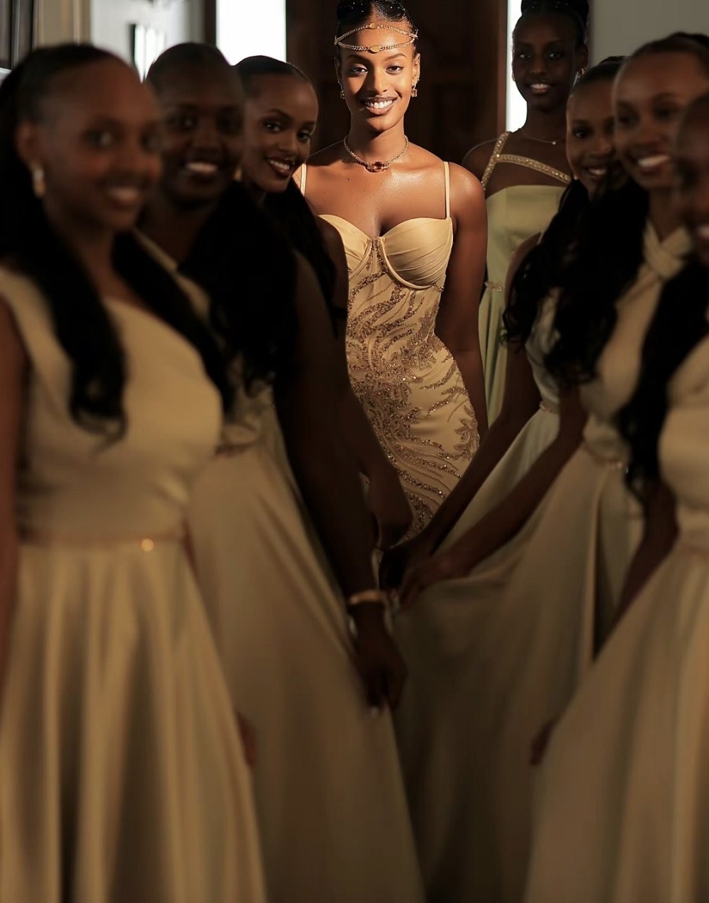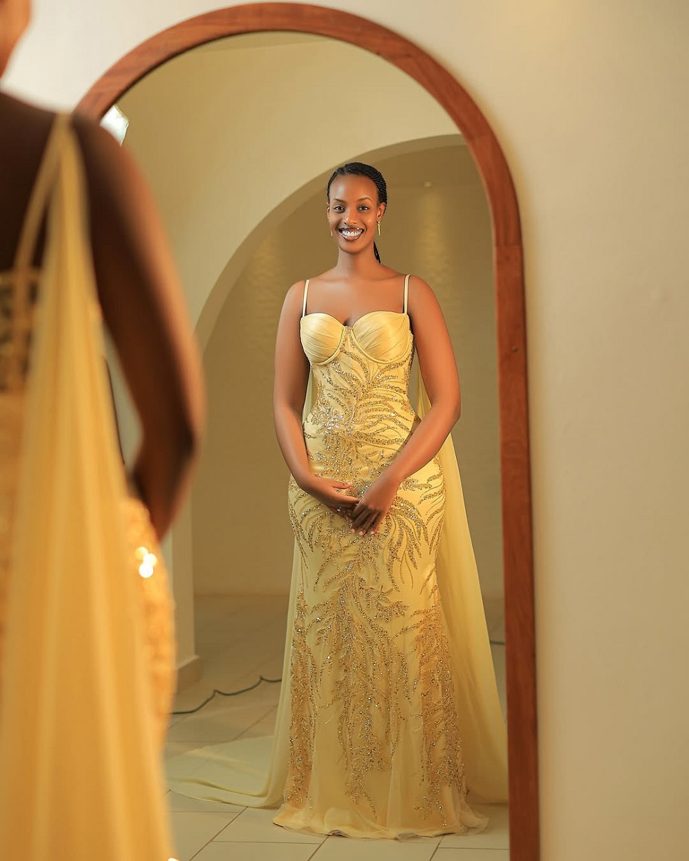 Amafoto, yashyizwe ahagaragara na Kwesh Bridals, agaragaza Sasii yipima ikanzu y’ibara risa nka zahabu, agaragaza ishusho y’uko azaba asa ku munsi we w’ubukwe.
