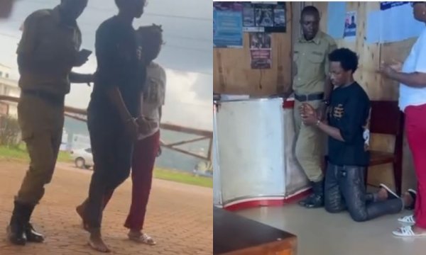Aya mashusho yari aherekejwe n’andi agaragaza uyu munyarwenya apfukamye mu biro bya Polisi ubona ko ya nkumi yari imutwaje inkweto noneho iri kugerageza gusobanurira abashinzwe umutekano ikibazo.